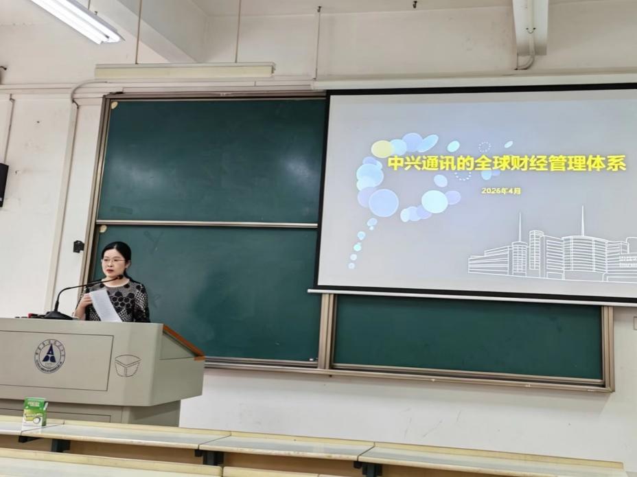 本网讯 (通讯员 李佳芮)4月16日上午,中兴通讯副总裁徐琴女士应邀莅临文添楼310教室,为我院2025级全日制会计专硕研究生讲授《财会审前沿问题研究》课程,本次课程以中兴通讯的全球财经管理体系为核心主题,由学院专硕导师组组长季华副教授主持,全体学生认真聆听、积极互动,课堂氛围热烈而充实。