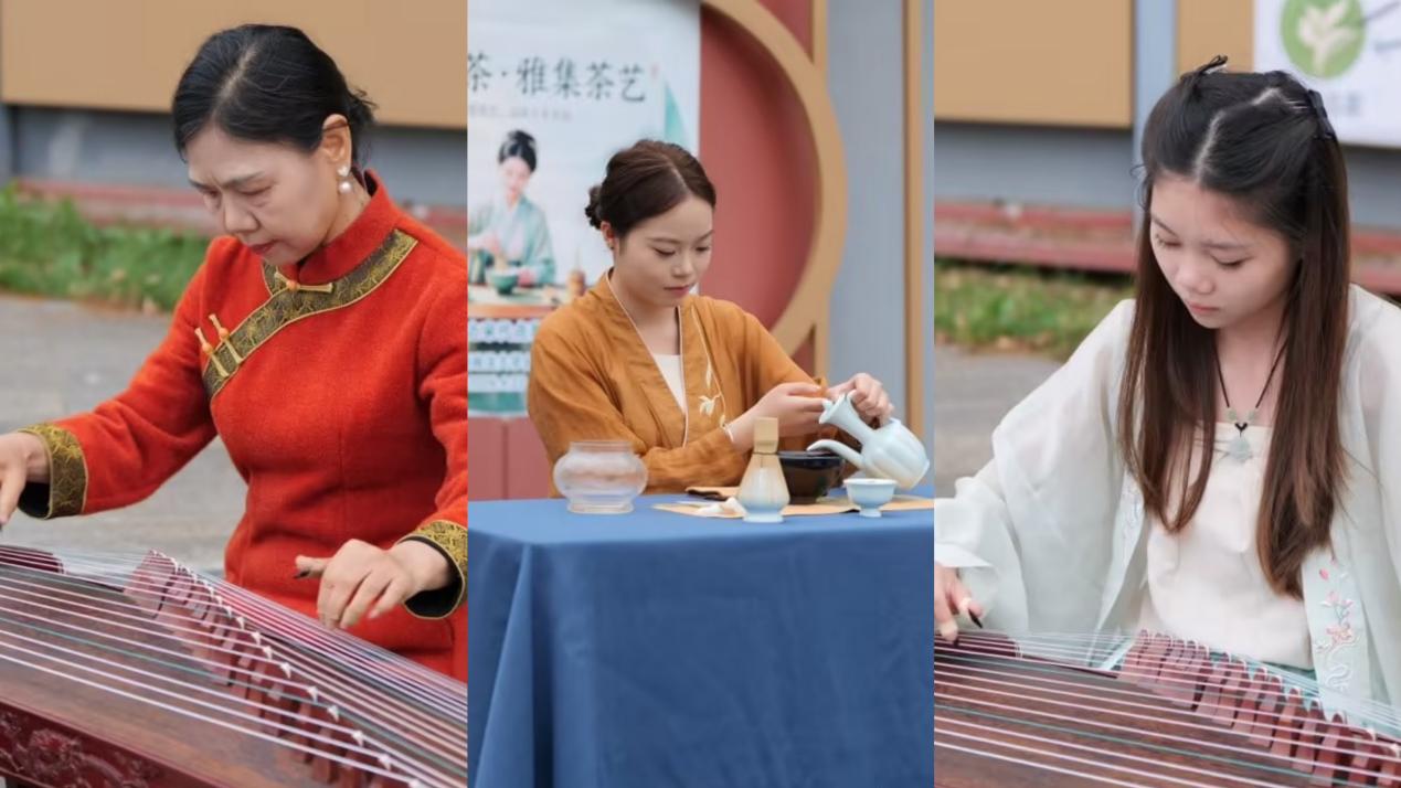 舞蹈落幕,点茶茶艺表演正式登场。演艺人员端坐抚琴,泠泠琴音如清泉流淌。茶艺师在琴声中展示点茶技艺,她们温杯烫盏、调膏注水、击拂成沫,腕转之间,七汤点茶步步考究。从细沫初现到雪沫乳花铺满盏面,每一个动作行云流水、温婉雅致,将宋代点茶的极致美学演绎得淋漓尽致。大家沉浸其中,静静欣赏这份东方茶艺之美。