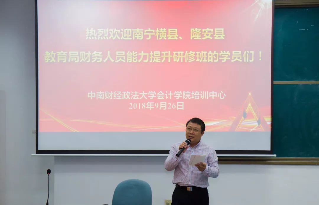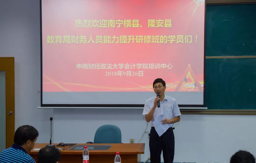 2018年9月25日至9月29日,南宁横县、隆安县教育局携手我院培训中心举办财务人员能力提升研修班。本次研修班通过课程讲授、案例讨论等活动,旨在帮助高校财务人员进一步了解我国会计改革与发展的新动态,准确把握现行政府会计制度、政府会计准则,进一步提高参会人员的政策水平、业务技能和综合素质。