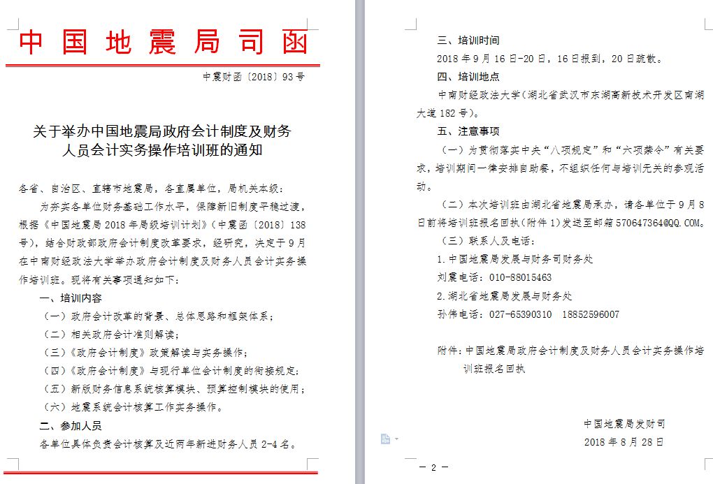 2018年8月28日中国地震局发展与财务司发布《关于举办中国地震局政府会计制度及财务人员会计实务操作培训班的通知》,明确此次培训由湖北省地震局联合中南财经政法大学会计学院承办。
