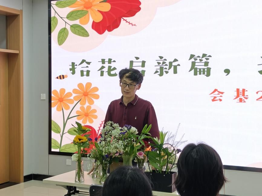 在插花艺术环节,支部成员系统了解了东方式、西方式及现代插花的不同风格特点,拓宽了审美视野。随后,同学们分组动手实践,利用准备好的花材、花瓶等物资,亲手创作插花作品。大家在协作中交流创意,在动手中感受美好,进一步体会到乡村振兴带来的生活之美与发展之机。