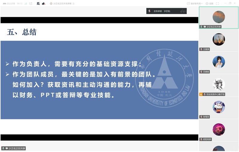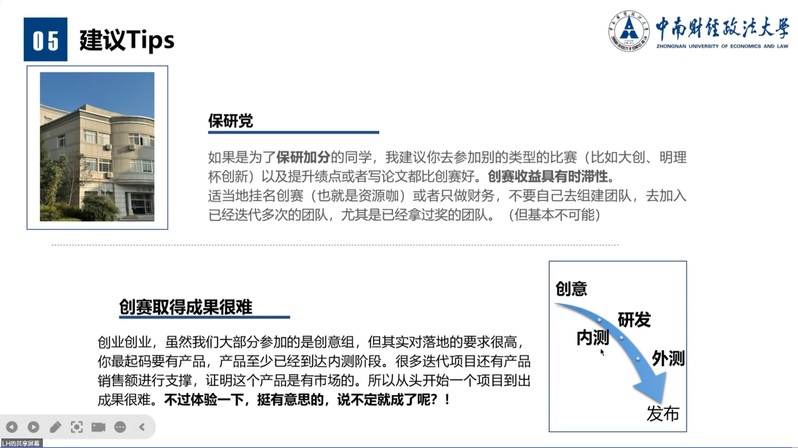 另一位重磅嘉宾——财智2201班林涵师姐则结合其在全国各大创赛中的实战经历,从赛事认知、选题策略、项目书撰写要点等方面展开讲解,并针对“如何平衡创赛与学业” 这一核心关切,分享了时间管理与目标规划的实用方法。此外,林涵师姐对有关项目选题、团队协作等问题提供了非常宝贵的建议,让师弟师妹们对创赛有了更立体的认知。