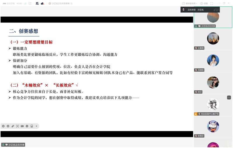 23日20时10分,分享会在线上腾讯会议正式开始。核心分享嘉宾——注会2203班沙芷名师姐,围绕“简历打磨、赛事实践、能力锻造” 三大核心维度展开分享,内容兼具指导性与实用性。谈及简历制作,她以自身简历为范本,从内容取舍到亮点凸显,手把手指导同学们打造“精准发力”的参赛简历,并特别建议大家善用学校就业中心资源,通过专业指导实现简历迭代升级。谈及创赛经历,沙芷名师姐从参与创赛的核心目的切入,深入阐述如何提升创赛竞争力。她鼓励大家聚焦“长板效应”,打造个人关键竞争力以增强不可替代性,在核心能力技能板块,师姐分享了主动高效获取资讯以紧跟竞赛动态,积极沟通以搭建优质信息差;把牢专业优势,用财务分析为项目决策提供数据支撑等多方面内容。
