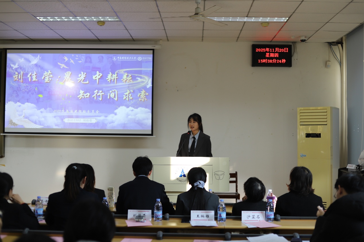 国奖获得者会计2302班刘佳莹以《晨光中耕耘,知行间求索》为主题,分享了自己“博观微取、厚积薄发”的心得。“我的大学故事,始于每一个于晨光里踏出宿舍楼,迎接朝阳与新鲜空气的平凡清晨,归于‘精业笃行,耕而不辍’的坚持。”她以“日拱一卒,功不唐捐”的努力精进学业,“广泛涉猎,锐意进取”的态度挑战科研,积极在学业上帮扶朋辈,书写互助共进、向阳而生的青春。