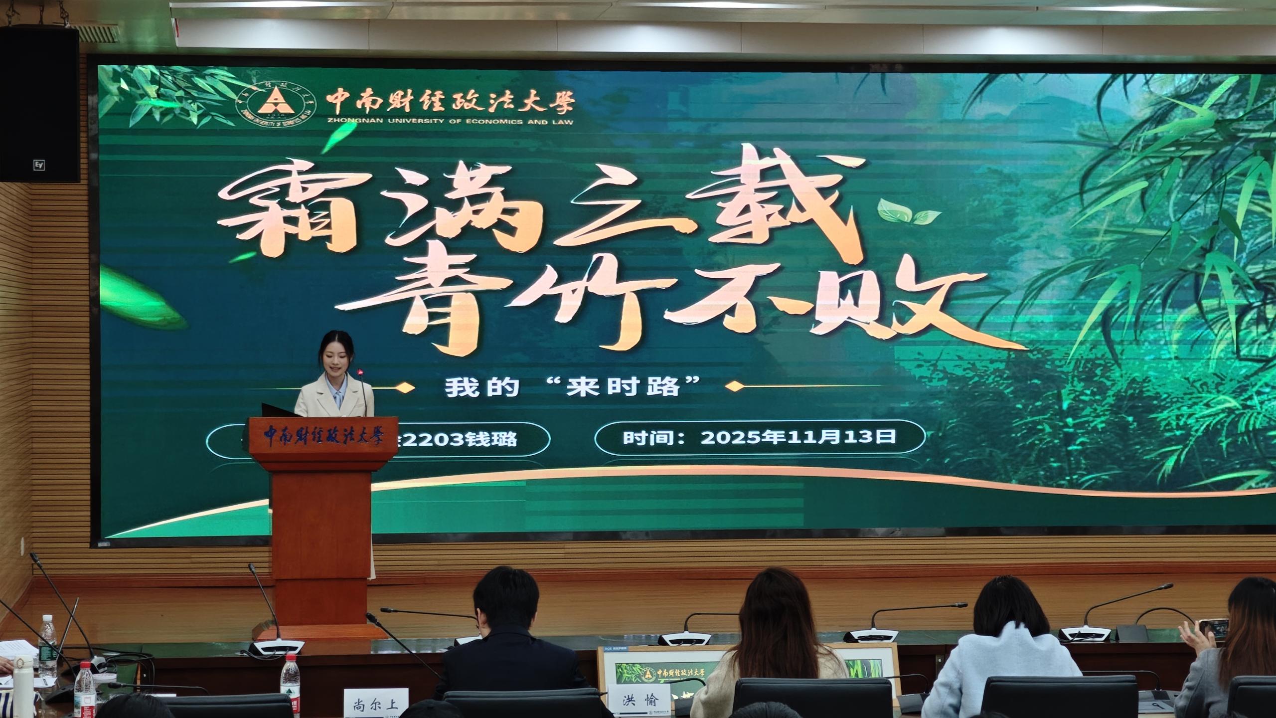 已推免至上海财经大学的国奖获得者注会2203班钱璐以《霜满三载,青竹不败》为主题,讲述了自己在学业上如新竹破土般“向光而生”,不断探索尝试的经历。重点分享了自己在遭遇挫折时,通过“勤能补拙,精益求精”的信念,对时间分配失衡及时反思并调整,最终抵达目标的经历,启发着师弟师妹勇于面对挫折和坎坷。