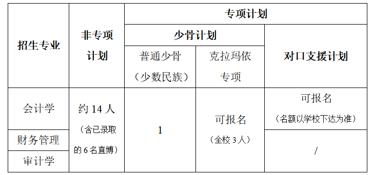 “对口支援专项计划”为定向培养招生计划,招生对象是受援高校在职教师中具有普通高等教育研究生学历和硕士学位的人员,申报受援高校为新疆财经大学、新疆政法学院、甘肃政法大学,招生专业为会计学。2026年具体受援高校及招生计划数以教育部下达为准。