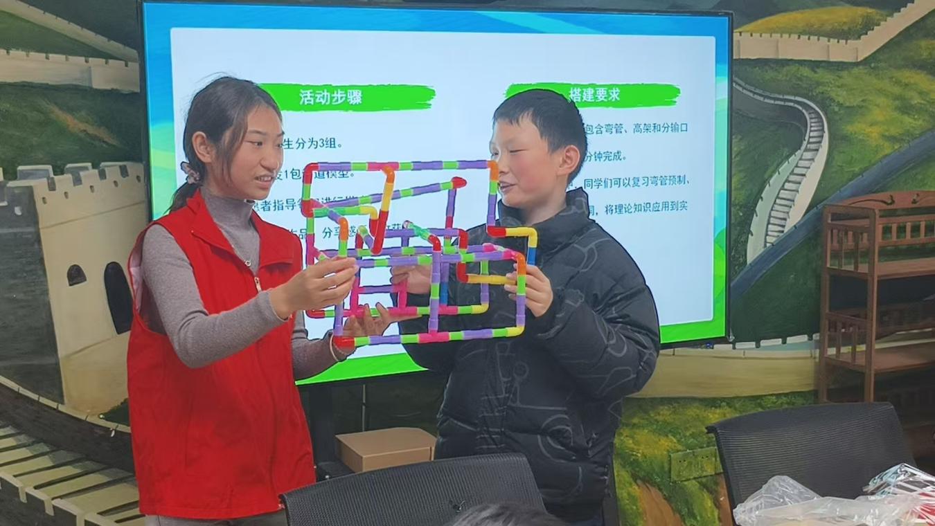 管道保护与实践体验环节干货满满。志愿者细致讲解管道建设的十七步流程,介绍场站、阀室、桩牌等管道保护设施的功能。最热闹的“小小工程师”挑战赛中,孩子们分组使用管道模型搭建运输轨道,需融入弯管、高架、分输口等元素,大家分工协作、积极沟通,有的主动出主意设计线路,有的专注动手拼接管道,遇到衔接难题时一起围坐商量解决办法,全程热情高涨、活力满满。搭建完成后,每组小朋友依次上台展示作品,勇敢分享团队的设计理念,有的说这样设计是为了让能源运输更顺畅,有的介绍作品特色是能同时输送到多个地方,表达既清晰又自信,充分展现动手能力与创新思维,也在分享中更深领悟管道搭建的严谨性与能源输送的重要意义。