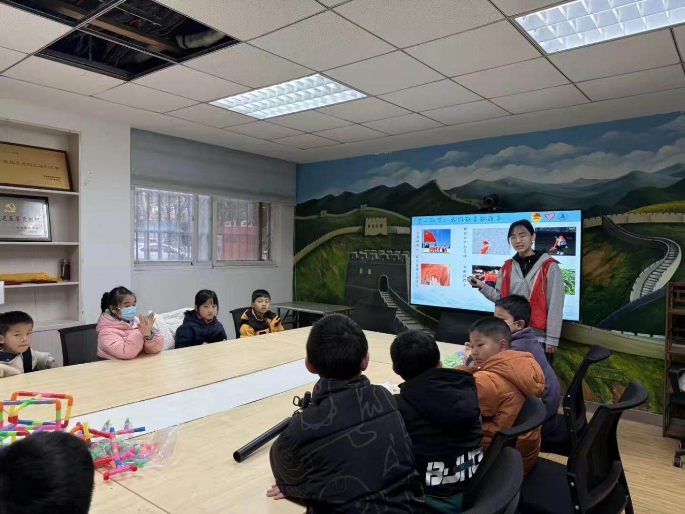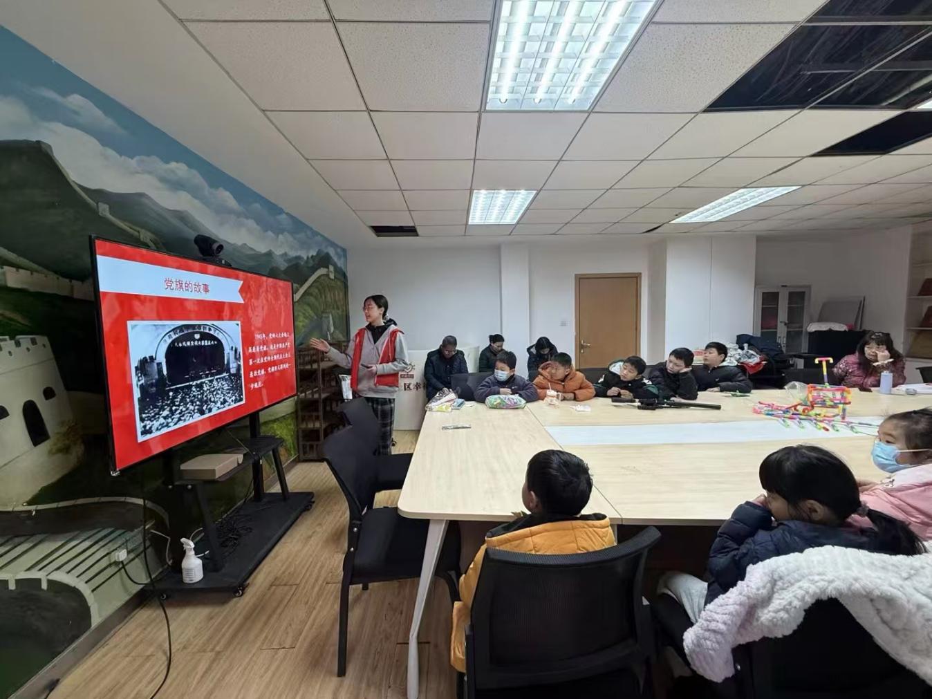 课程开篇以“祖国旗帜在我心”为核心,志愿者借助图文并茂的讲解,带领孩子们系统认识党旗、国旗、军旗、团旗与队旗。从党旗镰刀锤头象征的先锋使命,到国旗五颗五角星承载的国家信仰,从军旗“八一”标识背后的建军初心,到团旗、队旗蕴含的青年与少年担当,每一面旗帜的含义都被清晰解读。讲解过程中,孩子们坐姿端正、目光专注,始终认真聆听每一面旗帜相关知识,当国旗的图片展示在眼前时,一名小朋友立刻高高举起小手,主动站起来分享自己知道的国旗故事,言语稚嫩却真挚,清晰讲述对国旗的认知与理解,赢得现场志愿者与小伙伴们的阵阵掌声。后续志愿者分享1945年党七大首次悬挂规范党旗的历史、宋树信奔波寻布缝制第一面五星红旗的坚守、1927年八一南昌起义孕育军旗的荣光等内容时,现场格外安静,孩子们眼中满是崇敬与动容,沉浸式感受红色基因的力量,厚植爱国情怀。