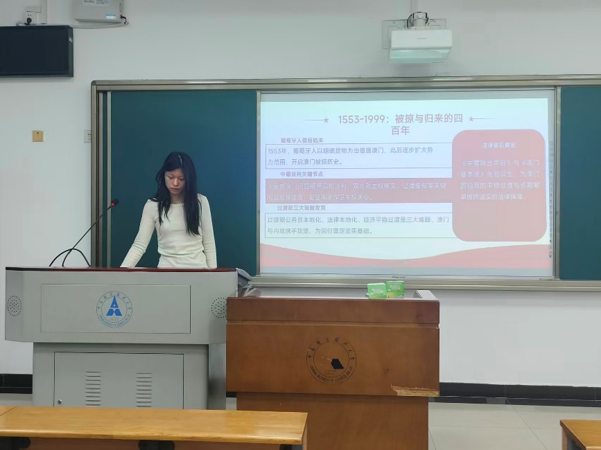 活动伊始,孟慧婷以时间为轴,带领同学们重温澳门“被掠与归来的四百年”历史。从1553年葡萄牙人借居澳门的历史渊源,到中葡谈判的艰难博弈,再到1999年12月20日零时主权交接的庄严瞬间,通过珍贵史料片段与细节解读,让同学们深刻体会到国家捍卫主权的坚定决心,感受“秒针背后的国家意志”。在“制度之光”板块,她围绕宪法与澳门基本法的法律根基,详细阐释“一国两制”“澳人治澳”的核心内涵,通过公务人员本地化、法律本地化等实践成果,展现这一制度对澳门稳定发展的强大保障作用。