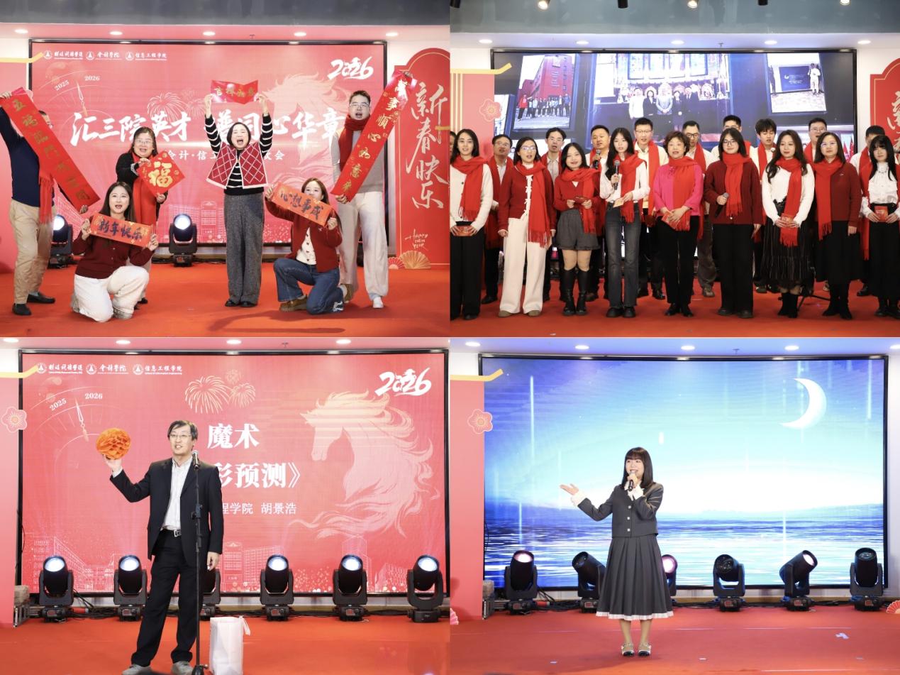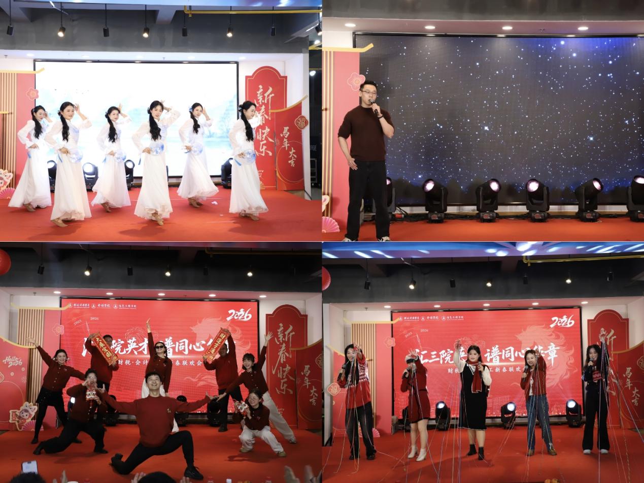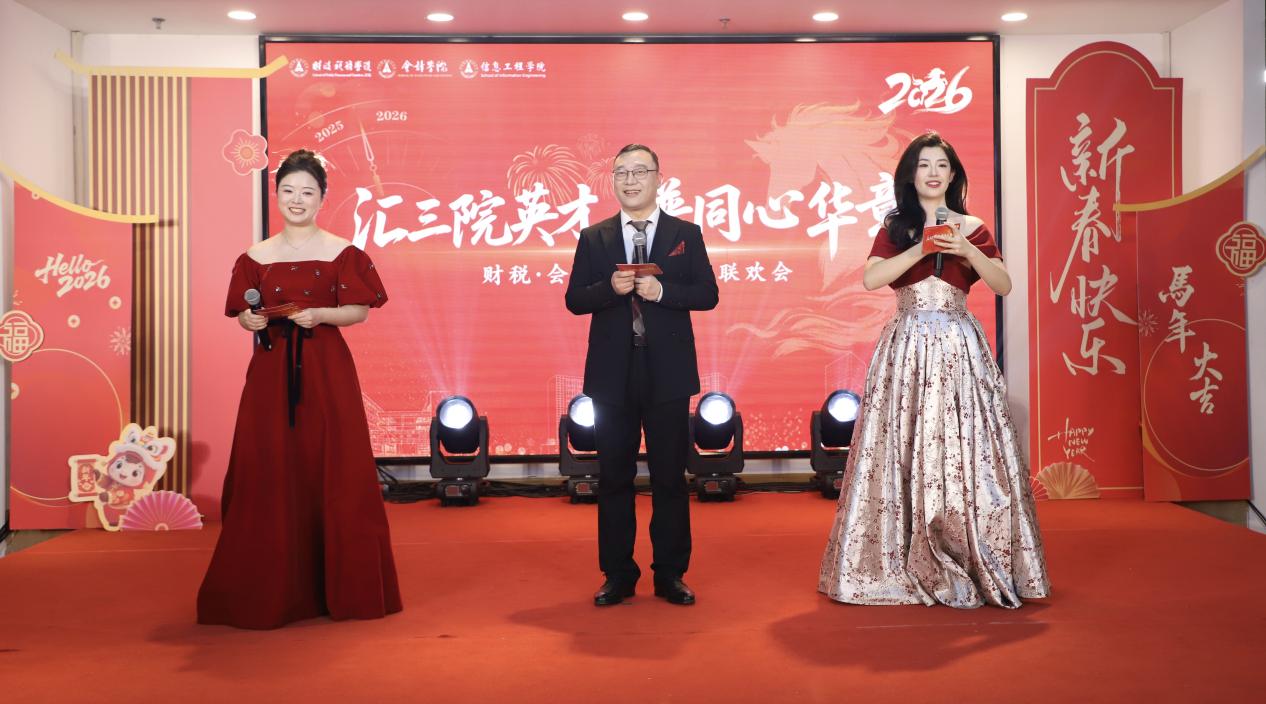 龙马腾跃启新程,三院同心贺新春。1月16日晚,会计学院联合财政税务学院、信息工程学院在望湖食堂举办“汇三院英才,谱同心华章”新春联欢会。校党委常委、副校长兼会计学院院长张琦,保卫部部长潘常刚,财政税务学院院长鲁元平、党委书记徐警武,会计学院党委书记周勇,信息工程学院院长金大卫、党委书记王芹等领导莅临现场,与三院教职工齐聚一堂。会计学院教授、研究生院副院长王华也倾情加盟,联欢会在轻松欢愉的氛围中展开,大家共叙情谊、共展才艺、共迎新春,呈现了一场兼具学科特色与人文温度的视听盛宴。