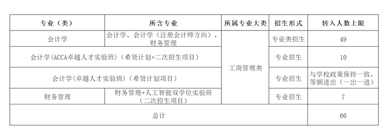 (二)根据学校政策,会计学(卓越人才实验班)按照等额进出(一出一进)动态调整原则,班级规模总量保持不变,转入指标根据转出人数确定,上限小于等于转出人数。