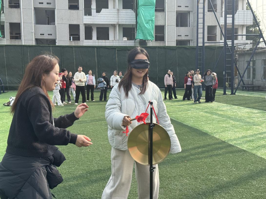 在蒙眼击锣挑战中,队员们克服眩晕,在队友的提示下稳步前行,全员顺利完成了敲锣任务。