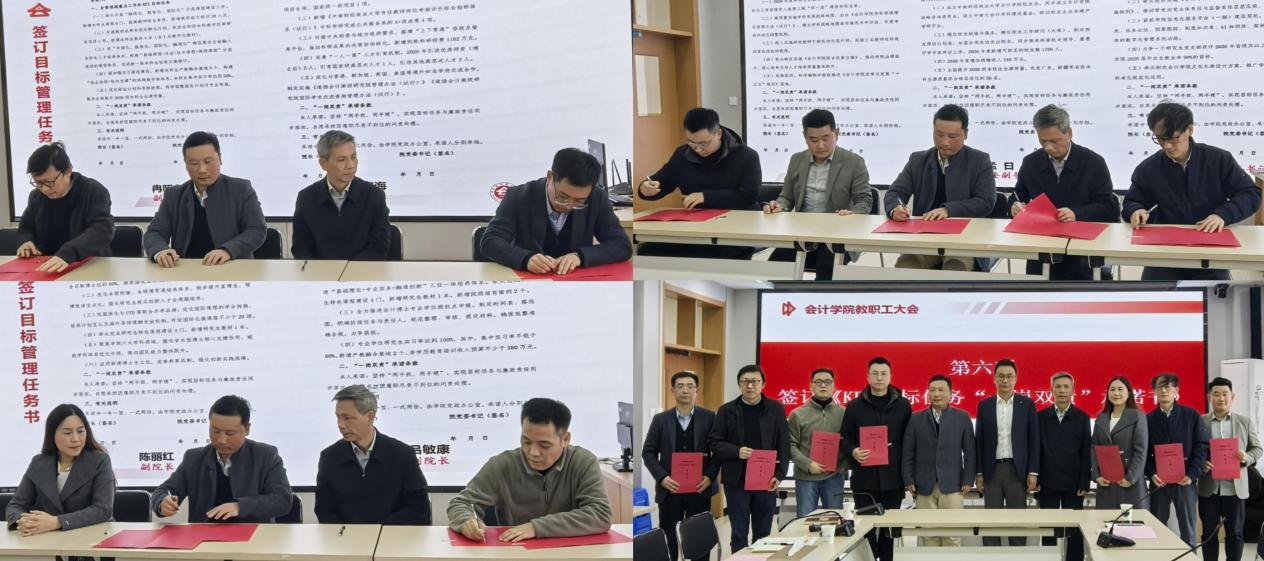 为进一步强化院领导班子责任意识、担当意识,推动形成层层抓落实、事事有人管、人人担责任的工作格局,大会专门举行《会计学院2026年度目标任务“一岗双责”承诺书》签订仪式,院领导正职与全体院领导副职进行签订,以郑重承诺筑牢责任根基,为学院各项工作高质量推进提供坚实保障。